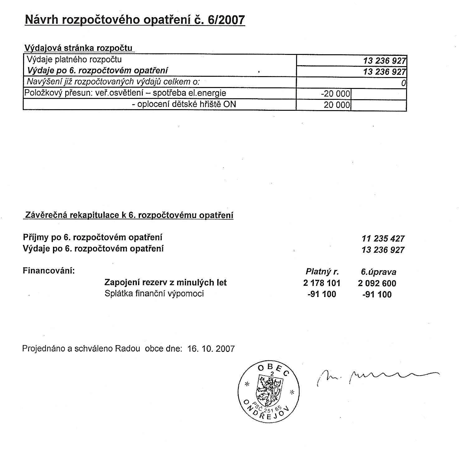 - Rozpočtové opatření 6/2007